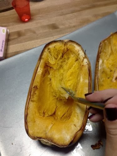 Cut the squash in half lengthwise; remove and discard seeds. Place squash on a baking sheet. Bake until tender, about 1.5 hours. Separate the strands of squash with a fork and place in a medium bowl; discard shells. Maintain the oven temperature.