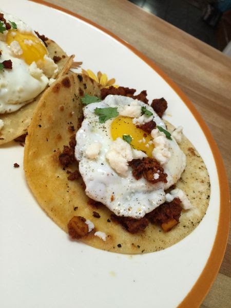 Heat a small non stick skillet over medium low heat and crack in one egg. Season with salt & pepper to taste. Using a lid that fits the pan or is slightly bigger then the pan, add 1 Tsp water in pan with egg and cover until Top of egg white is no longer clear and runny, but the yolk is still liquid (this is called basting the egg). The water will produce steam cooking the top of the egg without flipping it and overcooking it. While egg is cooking assemble one tortilla, topped with chorizo mixture. Remove egg from the pan and place on top of chorizo mixture. Top with crumbled queso fresco and cilantro.